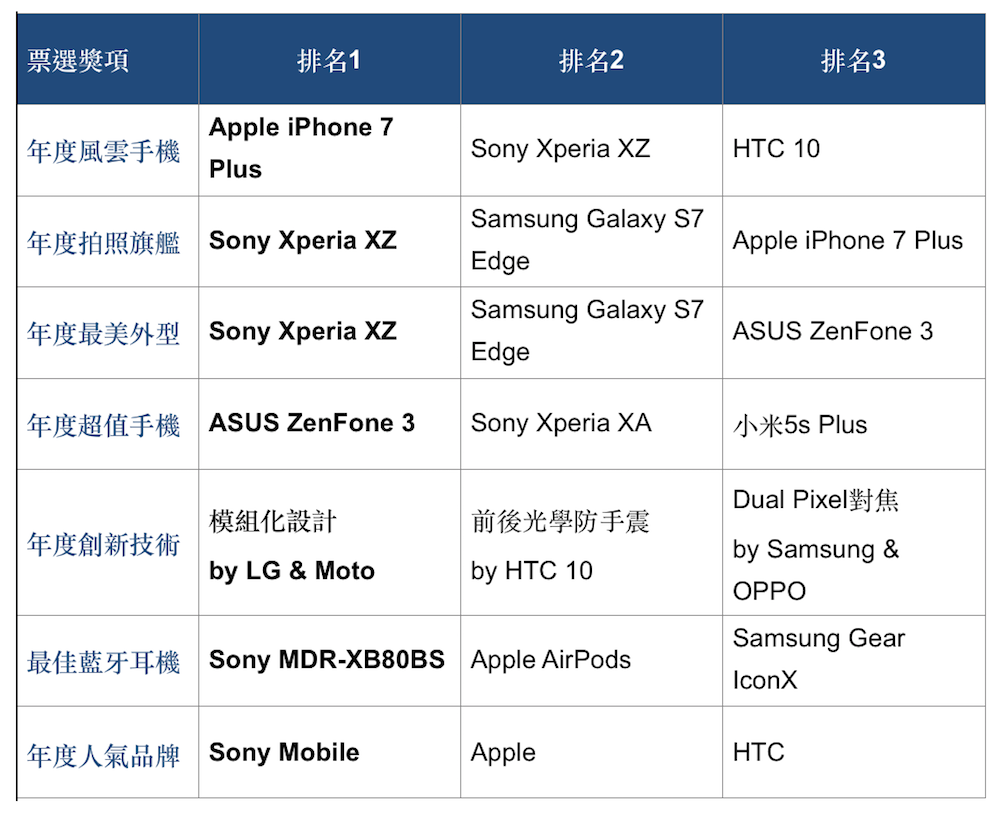 2016 年已過去,無論是好的壞的都已經成為過去了,在這新的一年中,我們不免要將 2016 年推出的智慧型手機產品拿出來比較一番,看看大家對於 2016 年所推出的智慧型手機產品的喜好如何?根據國內知名網站 ePrice 比價王所舉辦的「2016 年度風雲機」大賽的得獎名單來看,2016 年最受台灣網友喜愛的手機產品是 Apple iPhone 7 Plus、台灣自家品牌 ASUS ZenFone 3 則是拿下年度超值手機。此外,積極推出新機的 Sony Mobile,則是一次囊括年度拍照旗艦、年度最美外型以及年度人氣品牌,以三冠王之姿成為參賽品牌中的最大贏家。