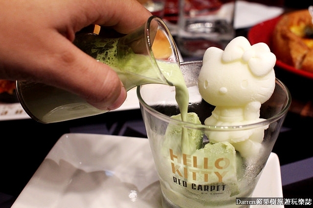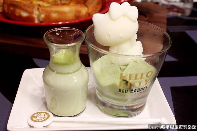 有卡哇依的Hello Kitty冰磚我選擇抹茶口味旁邊有溫抹茶要倒在杯子讓Kitty泡澡( ̄▽ ̄)