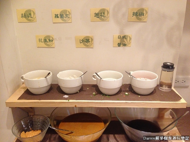 醬料和配料區有蔥花、花生粉、辣椒、沙茶等