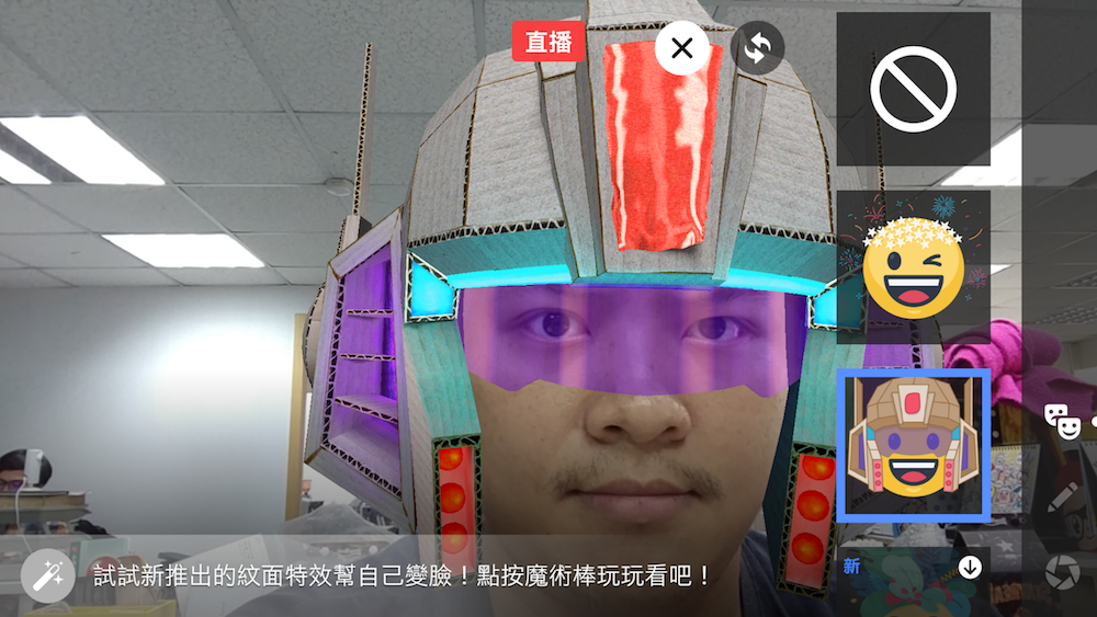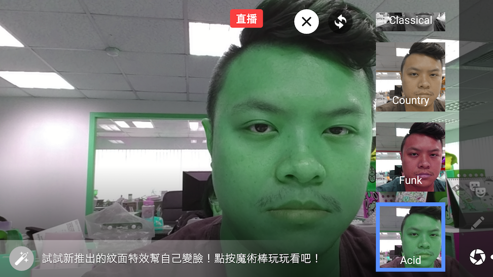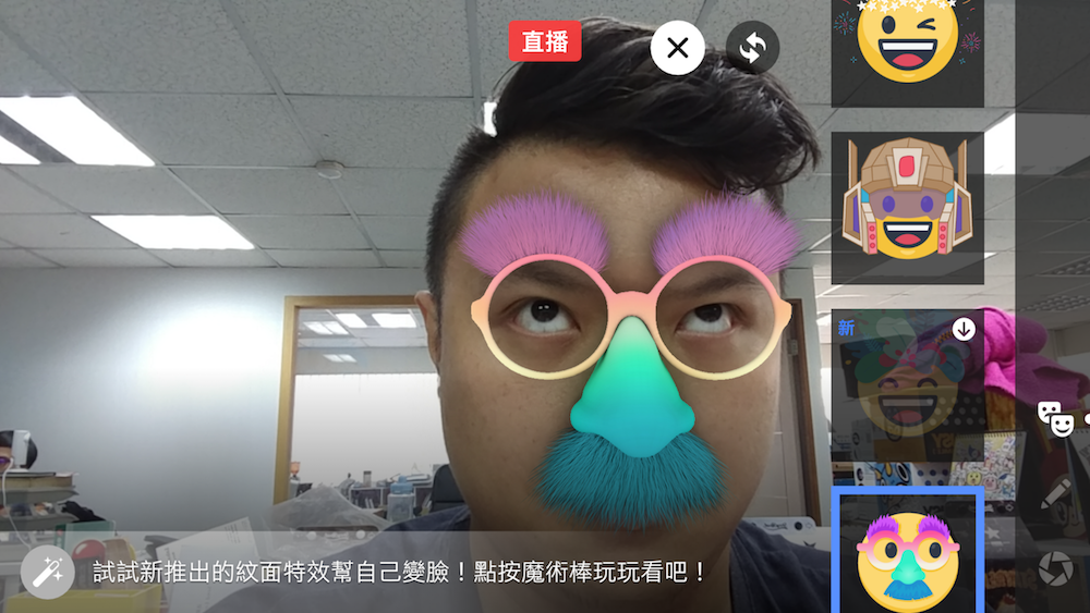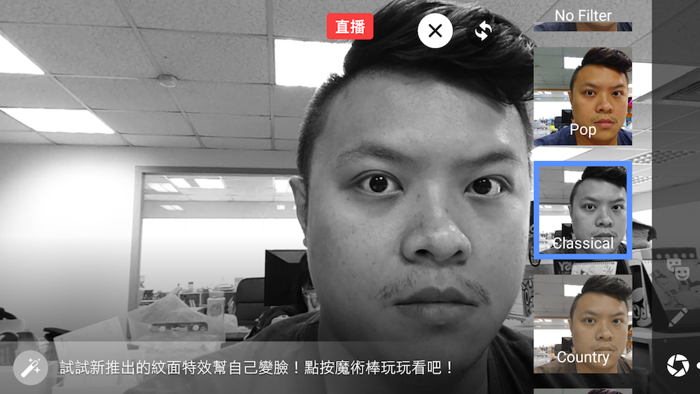 除了告訴大家如何將直播畫面從直立轉為橫向外,這邊也要順便提一下 Facebook 的直播功能中多種有趣的功能應用。像是可以改變畫面顏色的各種濾鏡、套用在直播主臉上的有趣面具、邀請好友觀看等,都可以讓直播主在直播的過程中使用。