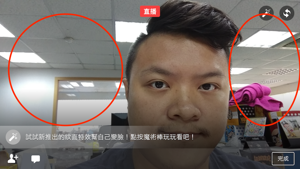 大家可以看到,當 Facebook 的直播畫面轉為橫向後,可拍攝的背景範圍也就跟著變大,這時就能輕鬆的讓更多人,或是更多背景一起入鏡。