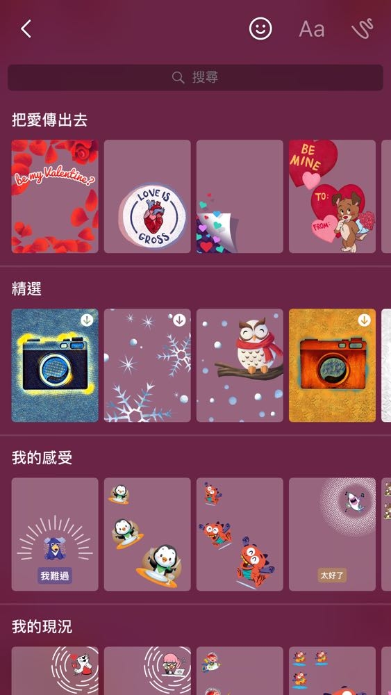 果然這就是 Facebook 為了情人節而加入的浪漫主題,只要點進去便能發現有著許多情人節主題背景,不管是熱戀中、失戀,甚至還有動畫式的範本提供挑選。而我們只要拍下照片,或是從手機中挑選照片,就可以開始進行編輯設計。