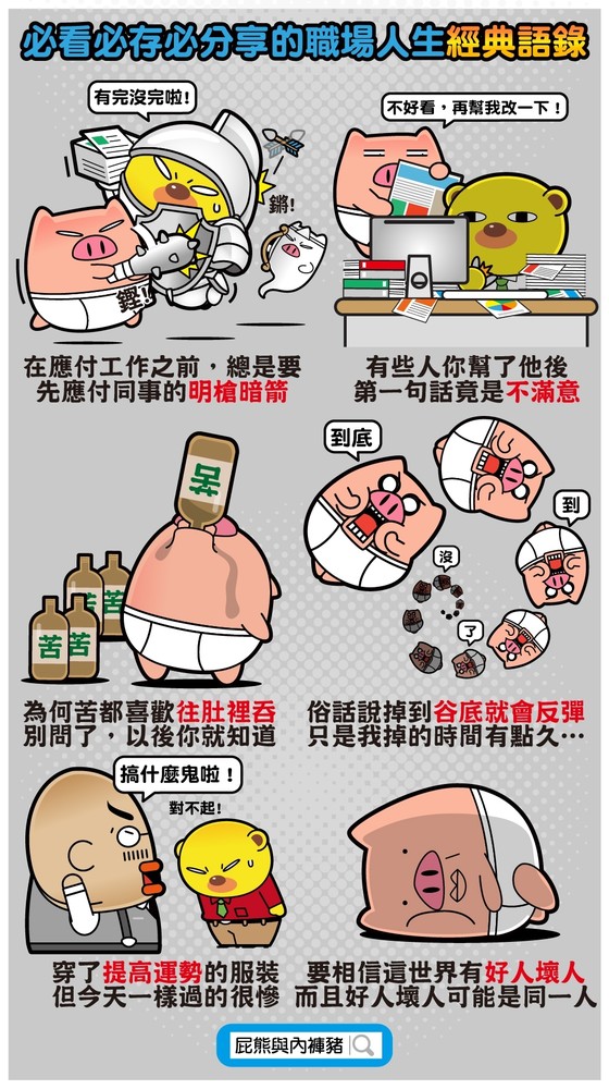 以上是屁熊真的都經歴過的,畫成漫畫跟大家分享,如果你還沒經歷過這些事,那麼代表你還很菜,不然就是你就是老闆,總之職場是非常變化萬千的,要怎麼讓自己每天都職場上全身而退,真的要學的東西很多…。職場人生的經典語錄下次見囉!