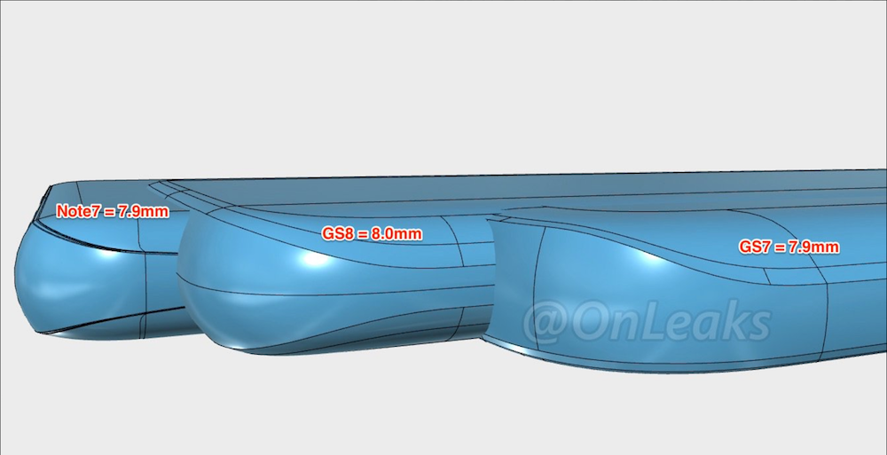 相較於 Galaxy S7 的 1.0mm、Note 7 的 0.8mm,Galaxy S8 的 0.2mm 幾乎達到將鏡頭模組完整平放在背蓋當中。而 S8 之所以還會突出 0.2mm 的高度,目的是為了保護鏡頭鏡片不直接與桌面接觸,才會額外設計的鏡片保護框。除了火山口已確定消失外,Galaxy S8 的機身厚度也將稍微向上調整一些,比 S7、Note 7 的 7.9mm 機身厚度多了 0.1mm,使厚度來到 8mm。邊框部分,Galaxy S8 採用與 Note 7 類似的設計,讓前後雙曲面玻璃的角度更為垂直,搭配位於兩塊玻璃中間的金屬邊框,使操作手感更勝同為雙曲面螢幕的 S7 edge。