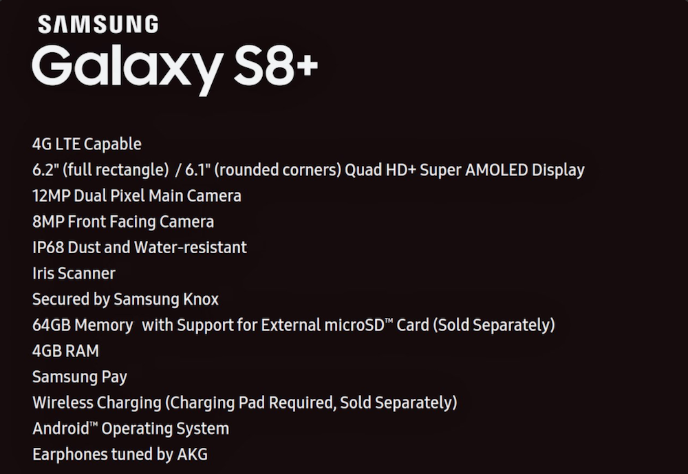 根據爆料大神 @evleaks 的圖片來看,三星 Galaxy S8+預計會採用 6.2 吋 2K 解析度 SuperAMOLED 螢幕,而 Galaxy S8 會如同先前報導的採用 5.8 吋 2K 解析度 SuperAMOLED 螢幕。兩款手機皆會採用 4GB RAM/64GB ROM 的記憶體與儲存空間配置,不過,處理器規格並沒有公佈,推測應該會採用新的 Exynos 9 處理器與高通 Snapdragon 835 處理器。相機方面,Galaxy S8+將會搭載 1200 萬畫素 Dual Pixel 主鏡頭、800 萬畫素自拍鏡頭。此外,Galaxy S8+將支援 IP68 防塵防水、無線充電、Iris 虹膜辨識功能以及 Samsung Pay,耳機則是請 AKG 來進行調教。