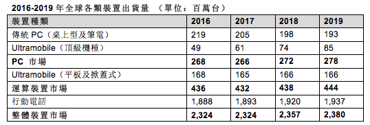 注:Ultramobile(頂級機種)包括採用微軟 Windows 10 作業系統的英特爾 (Intel)x86 產品,還有蘋果 (Apple) MacBook Air 等裝置。
