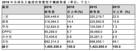 2016 年第四季全球智慧型手機對終端使用者銷售量(以下簡稱智慧型手機銷售量)總計 4.32 億支,較 2015 年第四季增加了 7%。蘋果(Apple) 也在 2016 年第四季超越三星 (Samsung),拿下全球智慧型手機龍頭廠商寶座。