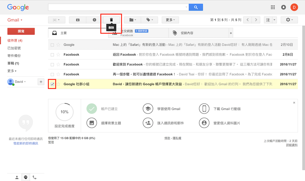 第一步 – 勾選信件,並點選最上方垃圾桶圖示
