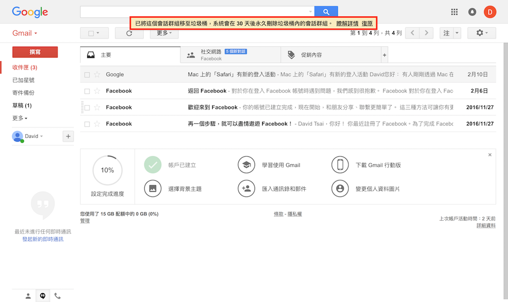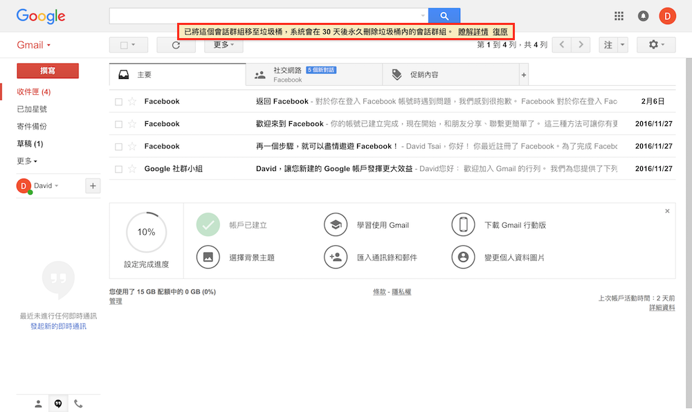 當畫面跳回收件匣,且出現「已將這個會話群組移至垃圾桶,系統會在 30 天後永久刪除垃圾桶內的會話群組」提示時,代表剛剛閱讀的那封信件已移動至垃圾桶中,若不進垃圾桶手動刪除該信件,Gmail 會在 30 天後自動永久刪除這封信件,以維持垃圾桶中的刪除空間。除了刪除信件功能外,Gmail 還另有提供反悔功能,若不小心誤刪了重要信件,可以點選最右側的復原來恢復信件。