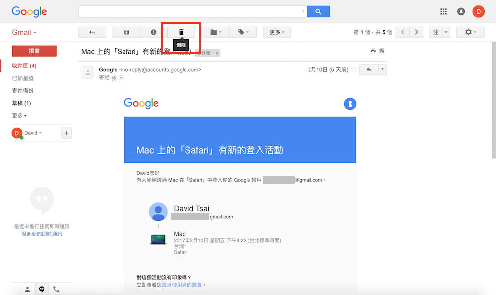 第一步 – 閱讀信件時,直接點選上方垃圾桶圖示