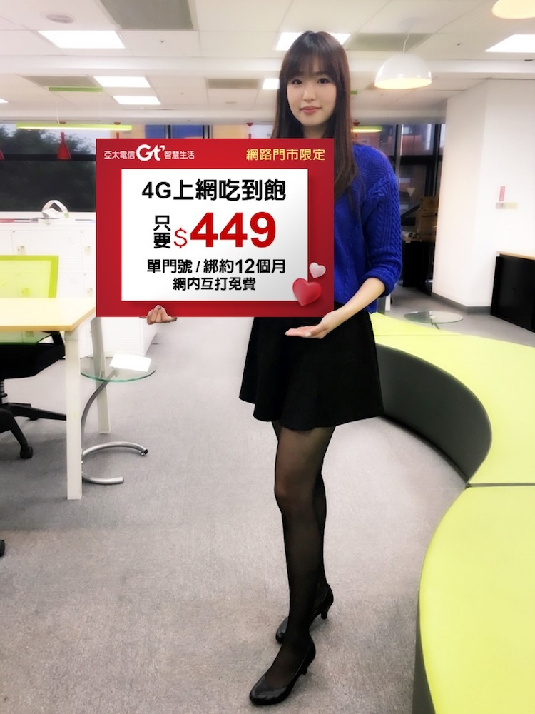 亞太電信網路門市單辦門號系列方案推出後,因 CP 值超高,高、中及入門的各資費都深受消費者好評,因應近期消費者對於 4G 上網吃到飽的需求,亞太電信網路門市推出全新單門號 449 方案,月付 NT$449 即享 4G 上網吃到飽,再享網內互打及網內簡訊免費、網外及市話共 30 分鐘免費,超過免費分鐘數也只要 NT$2/分、網外簡訊 NT$1.5/則,絕對是市場上最具競爭力的 4G 吃到飽方案。
