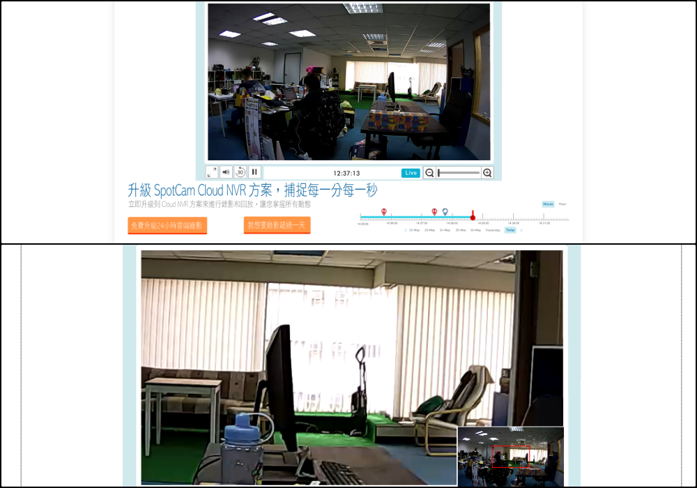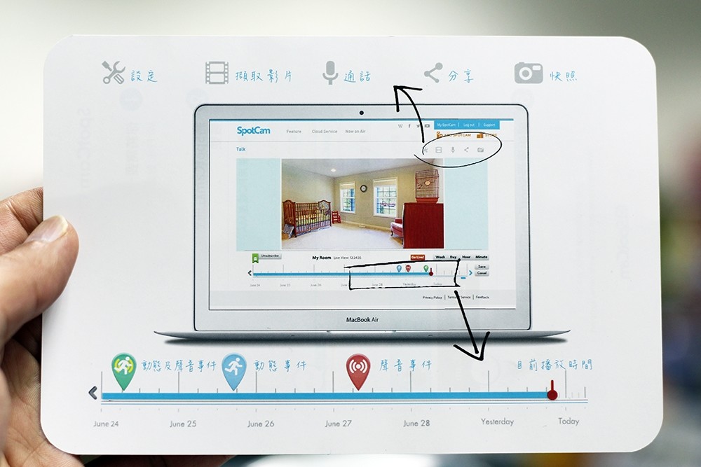 不論是室內或戶外防水版的,只要是 SpotCam 的系列產品,我覺得最重要的就是好好運用他們家的雲端服務,這也是和笨重主機說再見的設計關鍵,到 MySpotCam.com 就能隨時隨地觀看即時影像,提供像這樣的一日循環錄影是「永久免費」的,結合智慧動態偵測與聲音偵測的觸發,還可以在手機和 Email 收到警示通知,不只如此,還可以用社群網路分享您的 SpotCam 影像,講到這邊真的全部都免費啊!