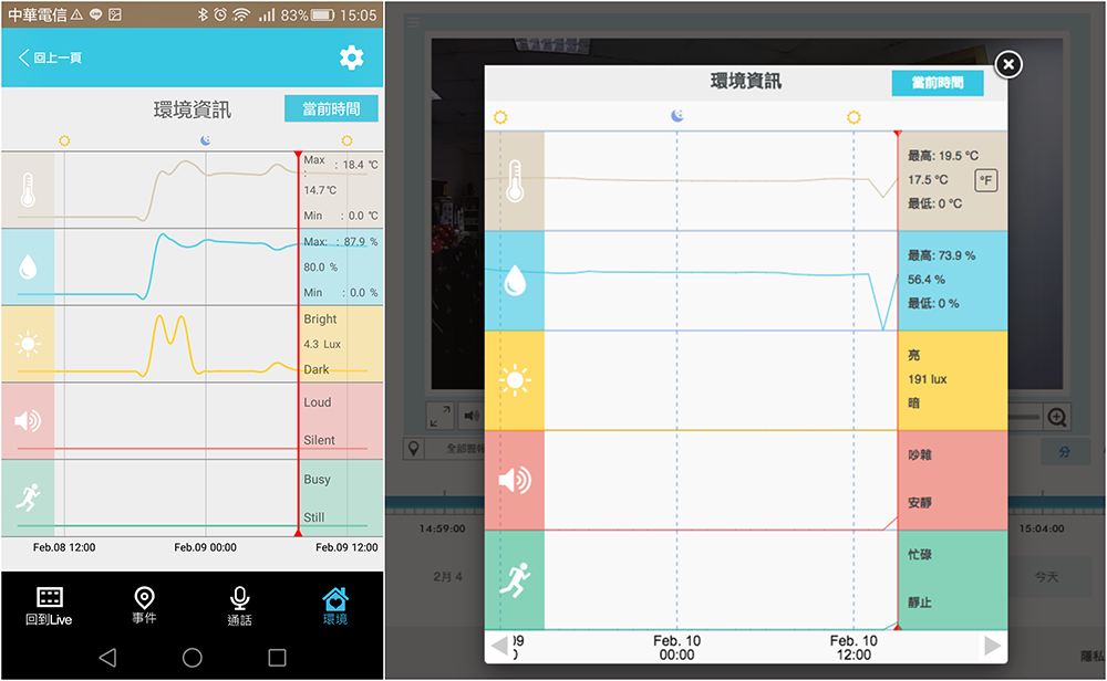 從原本的聲音和畫面移動,多了溫度、濕度、亮度的資訊之後,整個大進化了,用一段時間之後可以看到整個變化的圖形,知道當時的環境改變。