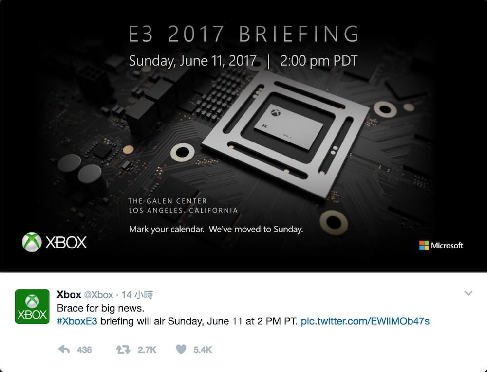 一年一度的遊戲盛會美國 E3 電玩遊戲大展,即將在今年的 6 月 13 日至 15 日於美國洛杉磯 The Galen Center 盛大登場,而同樣是電玩主機大廠的微軟 (Microsoft),稍早也在官方 Twitter 上宣布,將在 E3 2017 上發表「天蠍計畫」中的高階電玩主機 – XBOX Project Scorpio。