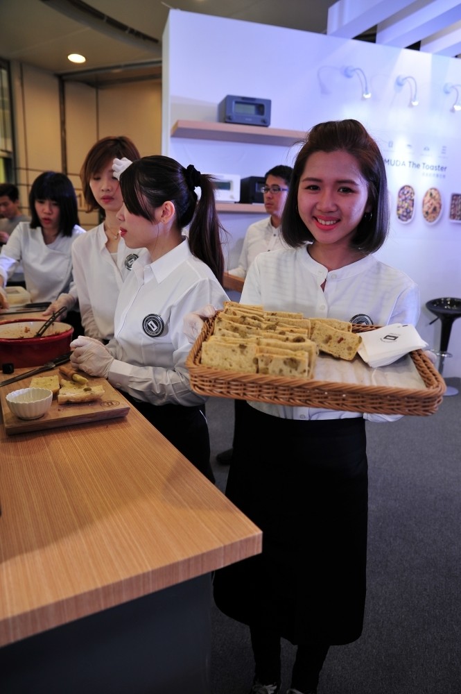 2月27日在台北舉辦新品體驗會,不但邀請藝人曲艾玲分享,另外國際知名麵包坊Lalos的主廚Guillaume Pedron吉雍佩登以及WUnique Pâtisserie甜點主廚吳宗剛也現身示範烤麵包機料理。吳宗剛講道,一般烤麵包機加熱可能需要2、3分鐘,但蒸氣烤麵包機最快15到20秒就熱了,其蒸氣技術與間歇性加熱,可讓麵包烤到外酥裡鬆軟、不烤焦。吉雍佩登說明一般買的麵包不會當天吃完,但利用BALMUDA The Toaster蒸氣烤麵包機,隔夜的麵包也能像剛出爐一樣。