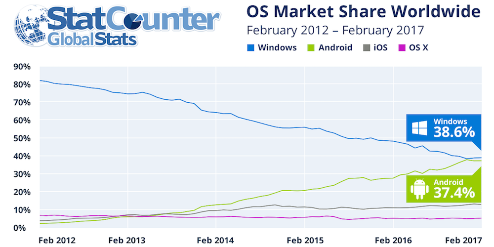 眼看曾經是市佔率最高的 Windows 作業系統即將被後起之秀 Android 作業系統超越,StatCounter 的 CEO Aodhan Cullen 則表示,如果 Windows 還想保住市佔率第一名的寶座話,積極開發與維護 Windows 10 作業系統是眼下可行的方法之一,當然行動裝置勢必會成為影響市占率的關鍵,但魚與熊掌不可兼得,先顧好自己的老本行再投入其他領域的開發與維護,才是維持領先的不二法門。