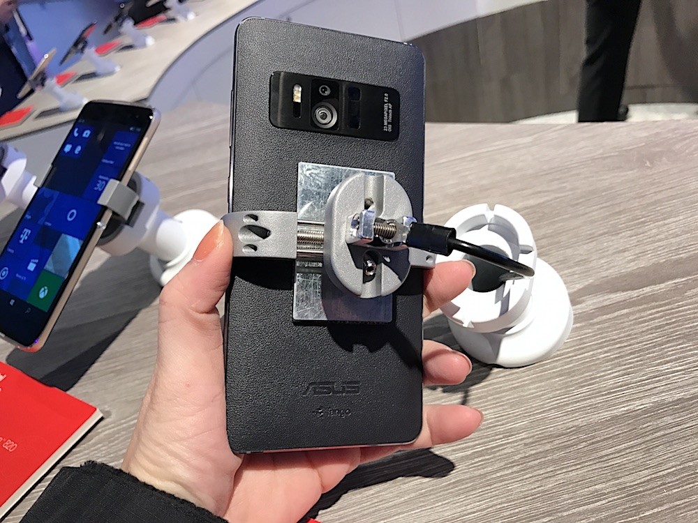 ASUS ZenFone AR 採用皮革背蓋設計,雖然現場的展示機裝有許多防盜裝置,但從旁邊的背蓋還是可以感受到背蓋出色的止滑效果與質感表現。