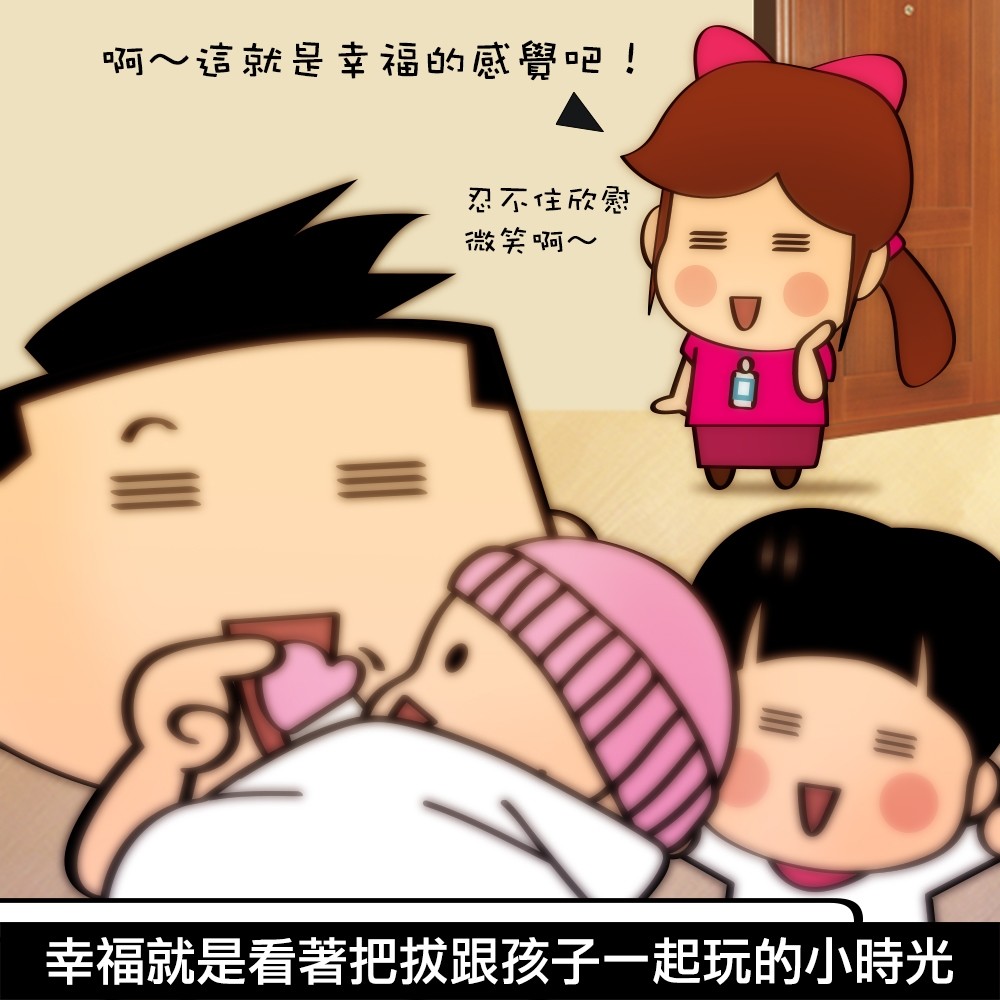 媽媽其實要的不多,有時候真的是看「奇摩子」而已,因為為了小孩真的是會無私的付出啊!所以當有的時候媽媽在一旁看到小孩和老公玩得很開心,還真的會忍不住嘴角上揚,除了能休息一下之外,還能看到把拔和小孩的可愛互動相視而笑的畫面,對媽媽來說這就是很簡單的小幸福啊(整個都想拍照錄影上傳臉書了!),所以有空好好花一點點時間陪小孩玩、講故事、畫畫圖都好,除了讓媽媽休息一下之外,也能多瞭解小朋友,好男人形象也能再度加分。