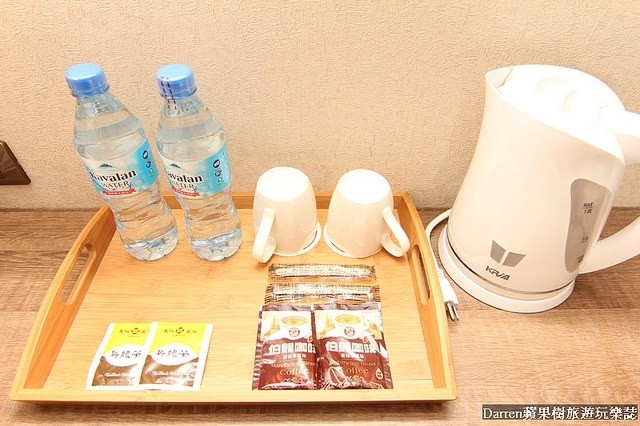 基本的桌面提供免費礦泉水、茶包、咖啡,在房間就有免費的寬頻有線和無線上網可以使用很方便