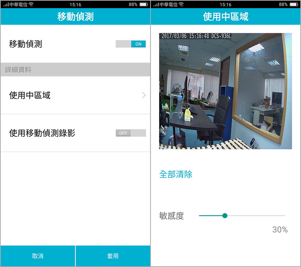 同時動態的移動偵測也是如此,透過監測畫面改變判斷的方式,系統能依照畫面佔比來讓我們自動設定移動敏感度,畫面有變動時便會自動發送通知,或是使用移動偵測錄影,當環境發現大變動時,便會同時發送通知並錄影,讓我們即時掌握最新狀態。