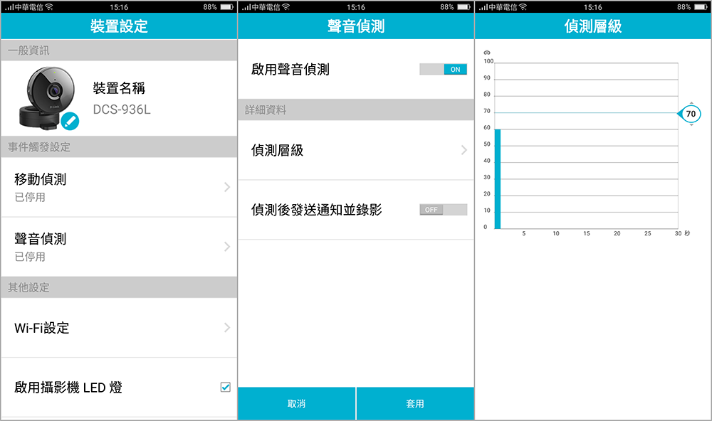 例如嬰兒的哭聲是 70 分貝,那我們就可以將偵測層級設為 70,當狀況發生時就能即時傳送訊息到我們的行動裝置。