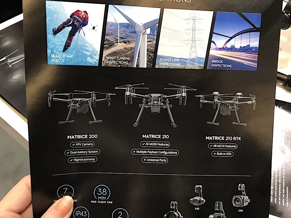 為了讓用戶可以輕鬆應付各種天氣狀況,DJI Matrice 200 具備 IP43 防塵防水功能,能在雨天中飛到空中進行空拍攝影的工作。此外,在 DJI Matrice 200 的 FPV 鏡頭的下方,原廠提供了兩個雲台穩定器,不僅可以攜帶一般變焦鏡頭,還能額外加裝熱感應鏡頭與其他鏡頭。據現場官方人員表示,DJI Matrice 200 並非一般空中攝影用的空拍機,會一次搭載兩個雲台穩定器,主要是讓用戶進行橋樑、建築物結構檢測時使用,不但能透過上頭的變焦鏡頭識別到毫米大小的破損,還能透過熱感應鏡頭與各種專業鏡頭來檢測建築物是否有熱能外洩等問題,讓建築物的結構安全能獲得充分把關。
