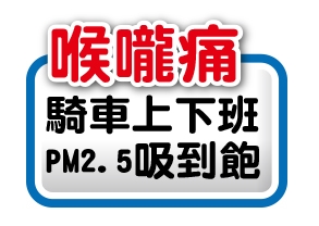 騎車上下班的朋友,現在如何口罩不隨時戴著,大概不出三天,喉嚨就會開始有毛病了…久了,搞不好連肺都會有事…尤其聽說要防PM2.5的話,口罩還是要保護力高級的才擋的住啊…。以後騎車乾脆扛著空氣清淨機好了…。