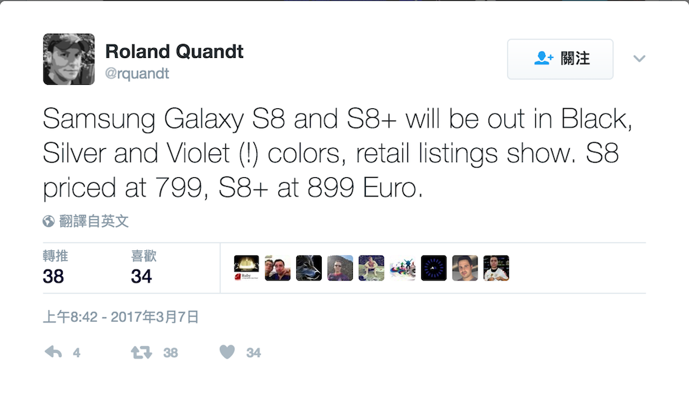 根據國外媒體 PhoneArena 引用爆料達人 Ronald Quandt 在個人 Twitter 上的資訊來看,未來三星 Galaxy S8 官方定價可能從 799 歐元起跳,折合新台幣約為 26,000 元左右,而具有 6.2 吋大螢幕的 Galaxy S8 Plus,官方定價可能會從 899 歐元起跳,折合新台幣約為 29,000 元左右。