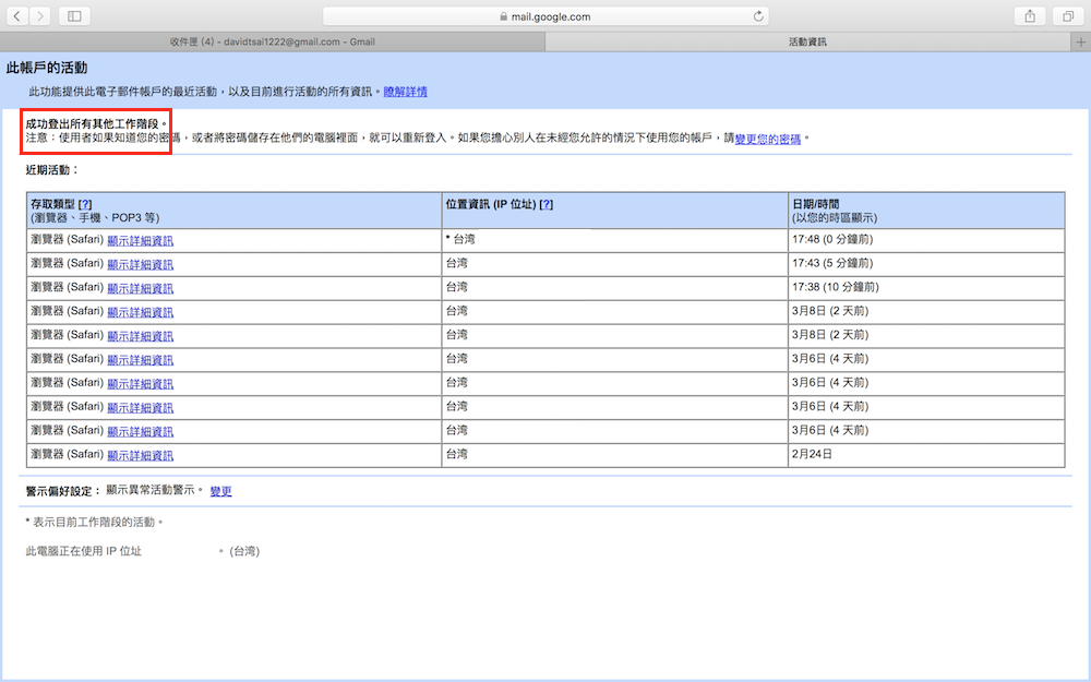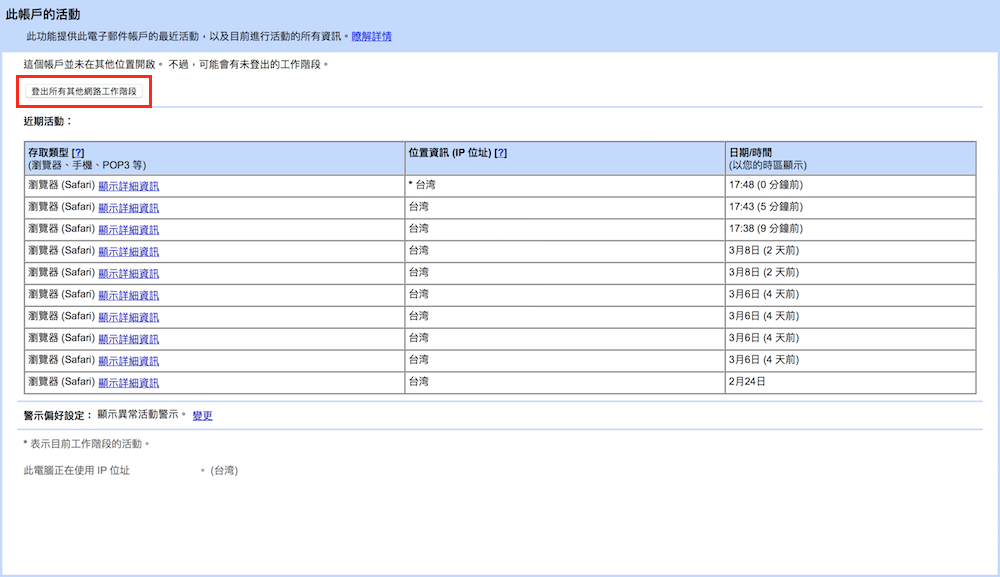進入「詳細資料」的頁面後,可以看到目前這個帳戶的所有活動,無論是在任何瀏覽器、位置、時間登入帳號,都會清清楚楚地列在下面的近期活動表格當中。若你想要遠端登出 Gmail 帳號,可以點擊「登出所有其他網路工作階段」,這時 Gmail 就會將所有目前登入中的帳號通通登出,以確保個資、重要信件不會外洩。