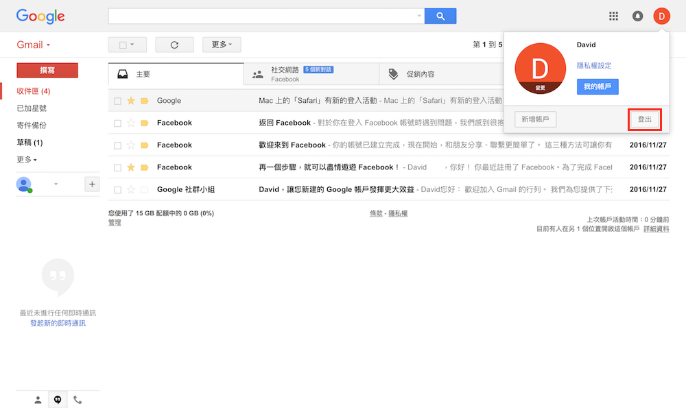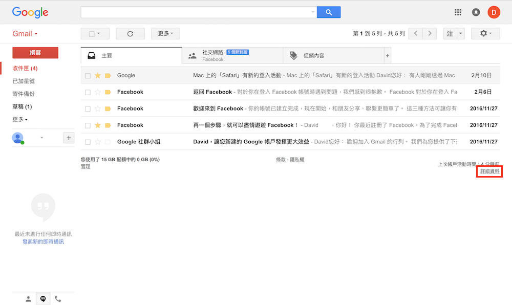 如果你忘了將公用電腦中的 Gmail 帳號登出,深怕會被有心人盜用或瀏覽重要信件,可以透過 Gmail 內的遠端登出功能來登出自己的 Gmail 帳號。只要在另外一台電腦登入自己的 Gmail 信箱,進入頁面後點擊右下角的「詳細資料」即可進入遠端登出頁面。