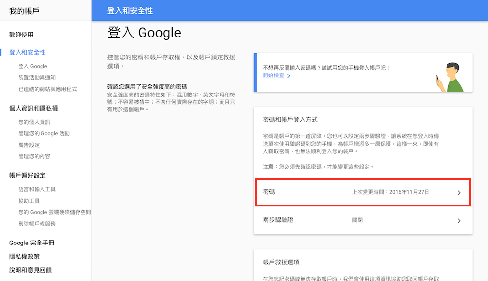 進入登入和安全性中的「登入 Google」選項後,請點選右下角有列出上次變更密碼時間的「密碼」欄位。
