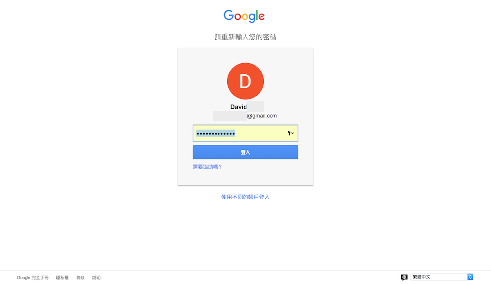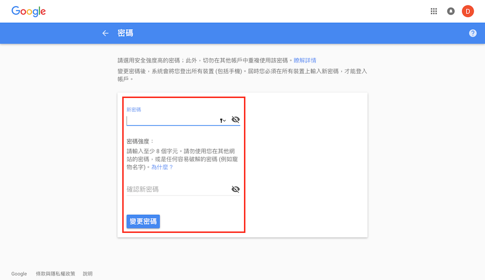 變更密碼之前,Google 會要求用戶輸入一次目前使用的密碼,密碼輸入完成後請直接點選下方的「登入」,之後就會出現下方的「變更密碼」頁面,只要在「新密碼」以及「確認新密碼」兩個欄位中輸入欲更新的密碼,接著再點選最下方的「變更密碼」後,即可完成 Gmail 與 Google 各種服務密碼變更。