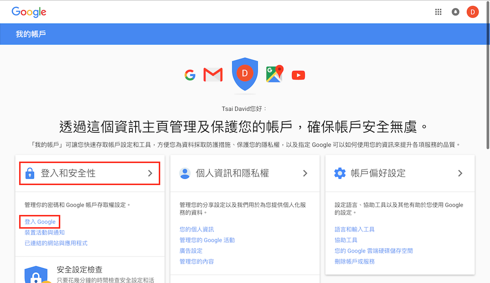 進入我的帳戶頁面後,請直接將目光移至「登入和安全性」,並點選其中的「登入 Google」選項。