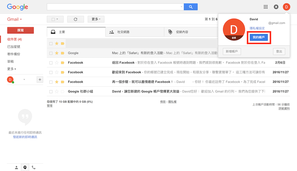 第一步 – 登入 Gmail 後,點選右上角的個人資訊中的「我的帳戶」