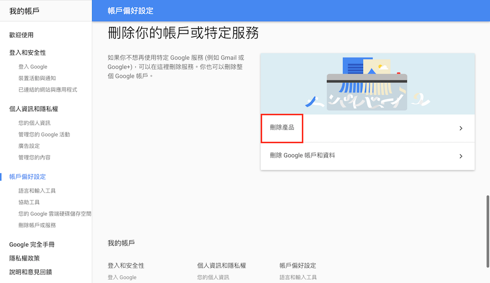 進入我的帳戶設定頁面後,請將目光移至最右側的「帳戶偏好設定」,並點選其中的「刪除帳戶或服務」,如此一來即可開始 Gmail 的刪除流程。