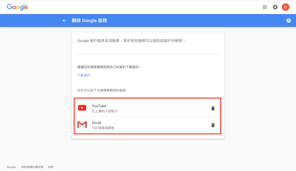 完成 Gmail 重新登入後,就會立刻看到「刪除 Google 服務」頁面,這時用戶就可以自行選擇要刪除的內容,比方這次是多餘 Gmail 帳號的刪除教學,我們就選擇下方的 Gmail 選項,點選最右側的刪除圖示後即可進入後續剩下的刪除流程,完成剩下流程該帳號的 Gmail 服務就會被刪除,未來再也不用擔心多餘帳號閒置以及帳號密碼混淆的問題。