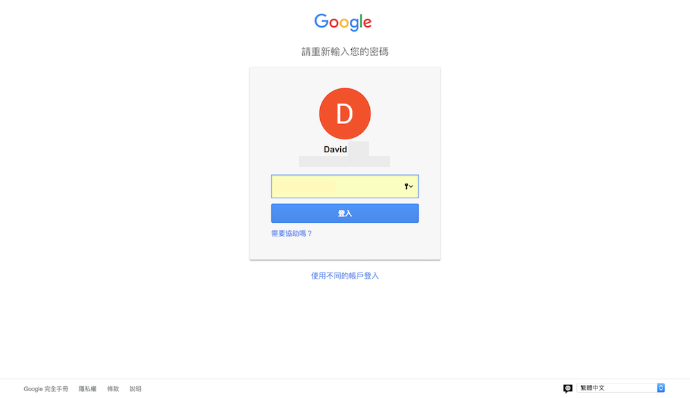 當點選上方的「刪除產品」後,Gmail 會要求用戶重新登入一次,這時只要輸入密碼登入即可。