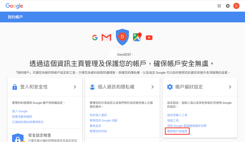 第二步 – 進入我的帳戶設定頁面,點選「刪除帳戶或服務」