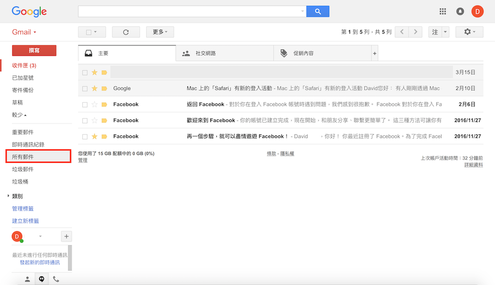 而被 Gmail 封存的信件,會全部歸類在「所有郵件」這個類別中,只要進入「所有郵件」後,即可讀取剛才封存的信件。