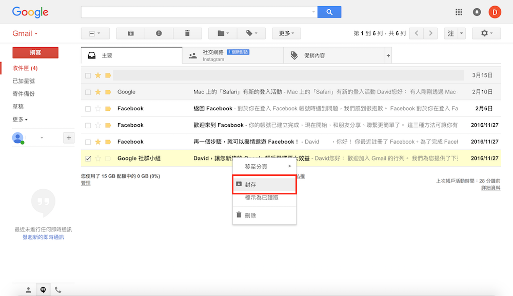 進入 Gmail 收件匣頁面後,請將滑鼠移動至不想被刪除的信件上,點擊滑鼠右鍵,就會看到裡面的「封存」選項。只要點選「封存」選項後,該信件就會被封存下來,就算一次將收件匣內的信件全部刪除,已封存的信件也不會被刪除。