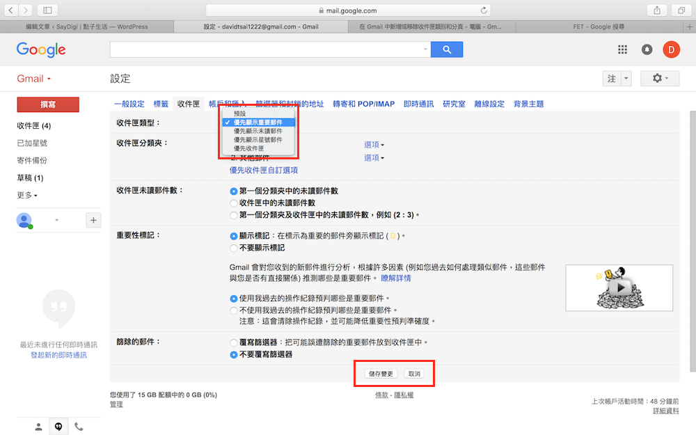 進入收件匣設定頁面時,請直接在收件匣類型中選擇需要的選項,除了預設之外,Gmail 還提供了優先顯示重要郵件、優先顯示未讀郵件、優先顯示星號郵件、優先收件匣等選項,用戶可以依照自己的需求來選擇,選擇後請務必點選最下方的「儲存變更」,這樣才能儲存變動的設定。