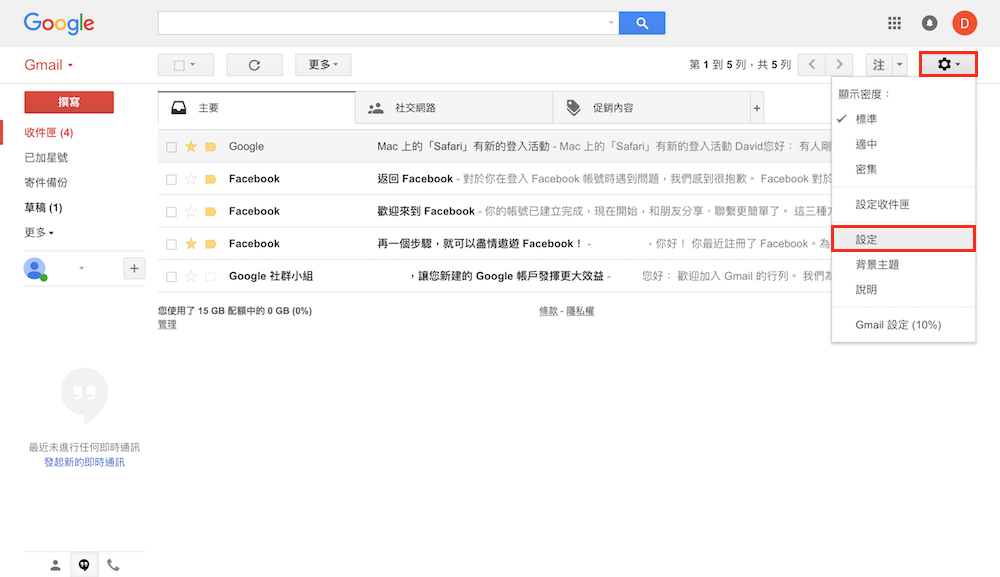 第一步 – 開啟 Gmail,依序點選右上角的「設定」圖示