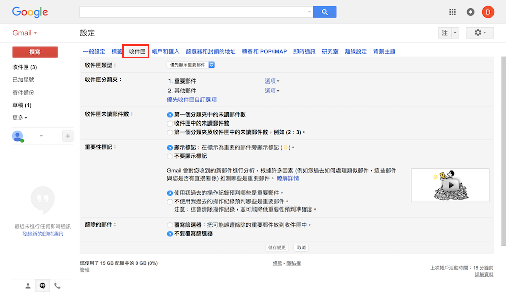 進入 Gmail 設定頁面後,請直接點選上方的「收件匣」分頁,接著就會立即進入收件匣設定中。