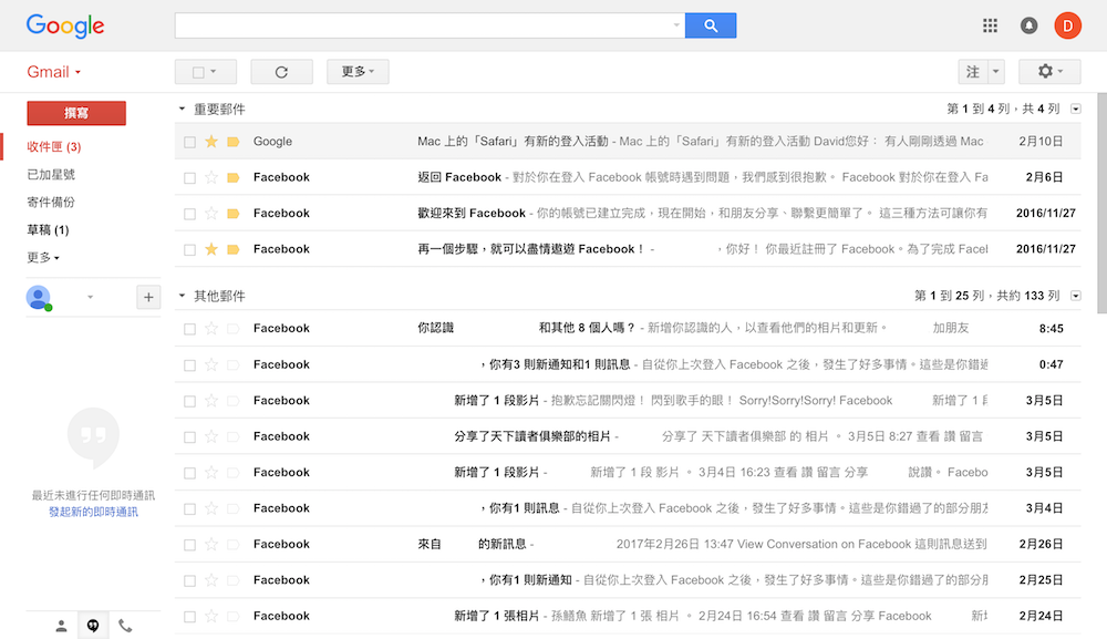 儲存變更之後,Gmail 會直接跳回收件匣頁面,這時用戶可以檢視一下信件是否有依照設定排列好,若沒有依照設定排列好,可以回到第一步從新來過。