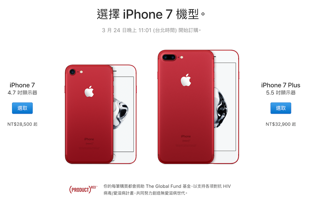 傳聞中的 iPhone 7/7 Plus (PRODUCT)RED Special Edition,就在今天晚上 (3/21) 正式在 Apple 官網上登場,消費者可於 3/24 星期五晚上在 Apple 官網及實體店面預購,每一筆消費也都將捐助 The Global Fund 基金,以支持各項對抗 HIV 病毒/愛滋病計畫,共同努力創造無愛滋病世代。