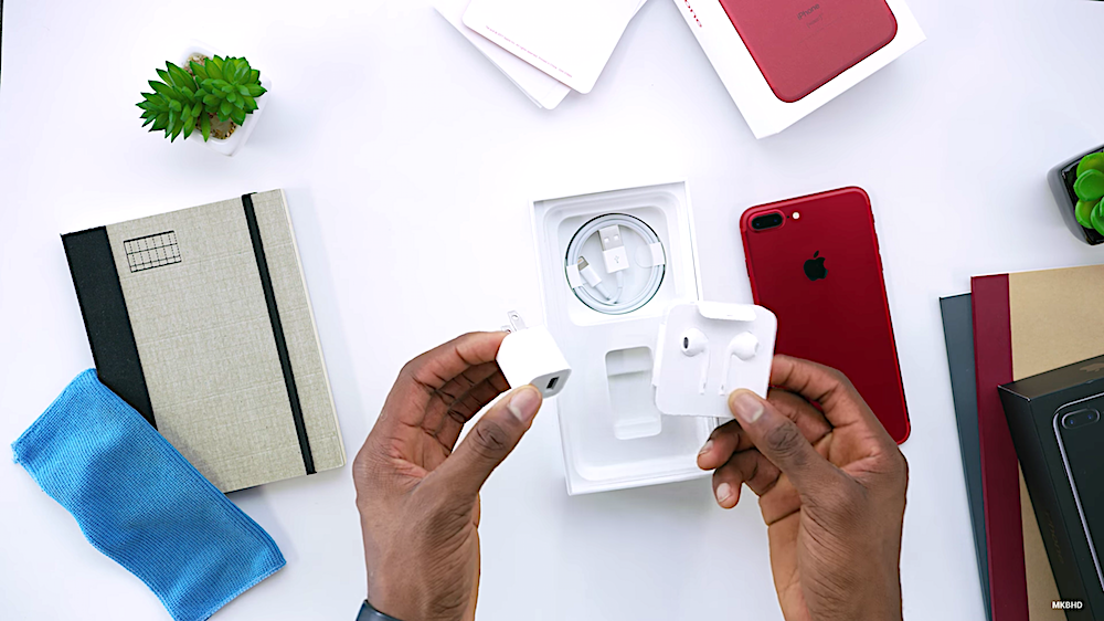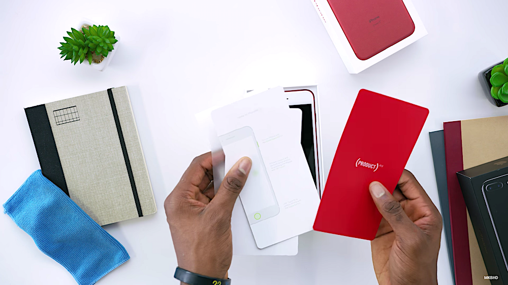 從這段開箱影片來看,iPhone 7 Plus (PRODUCT)RED Special Edition 的盒裝、配件皆與一般版本的 iPhone 7 Plus 相同,僅有手機外盒的各個圖示改為紅色,以及多了一張紅色 The Global Fund 的紙卡。