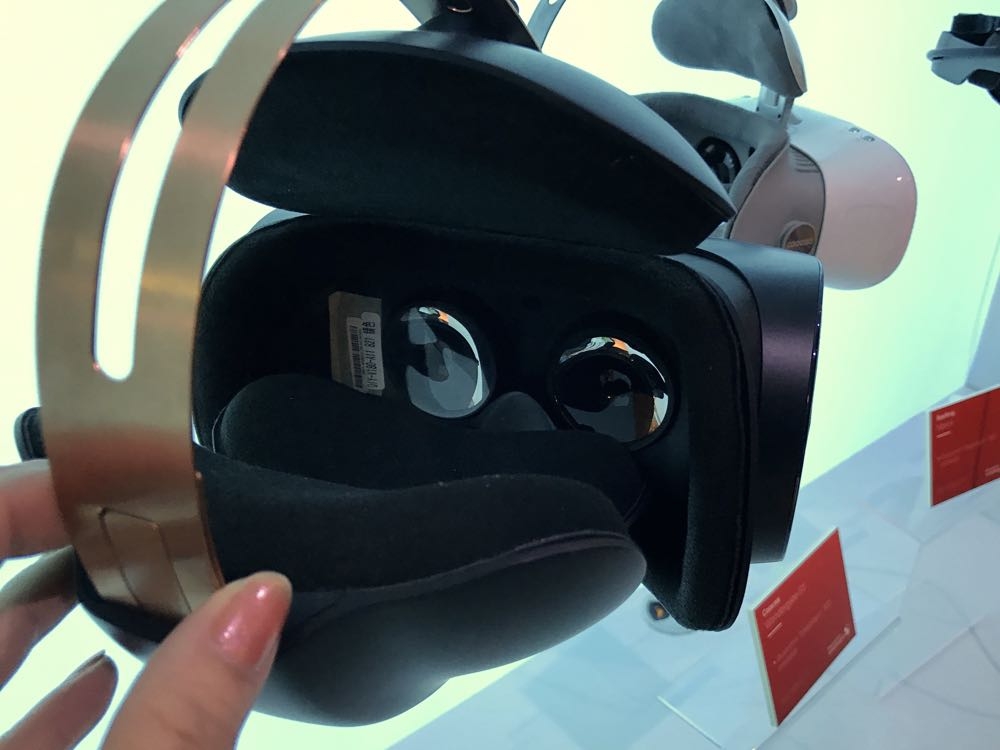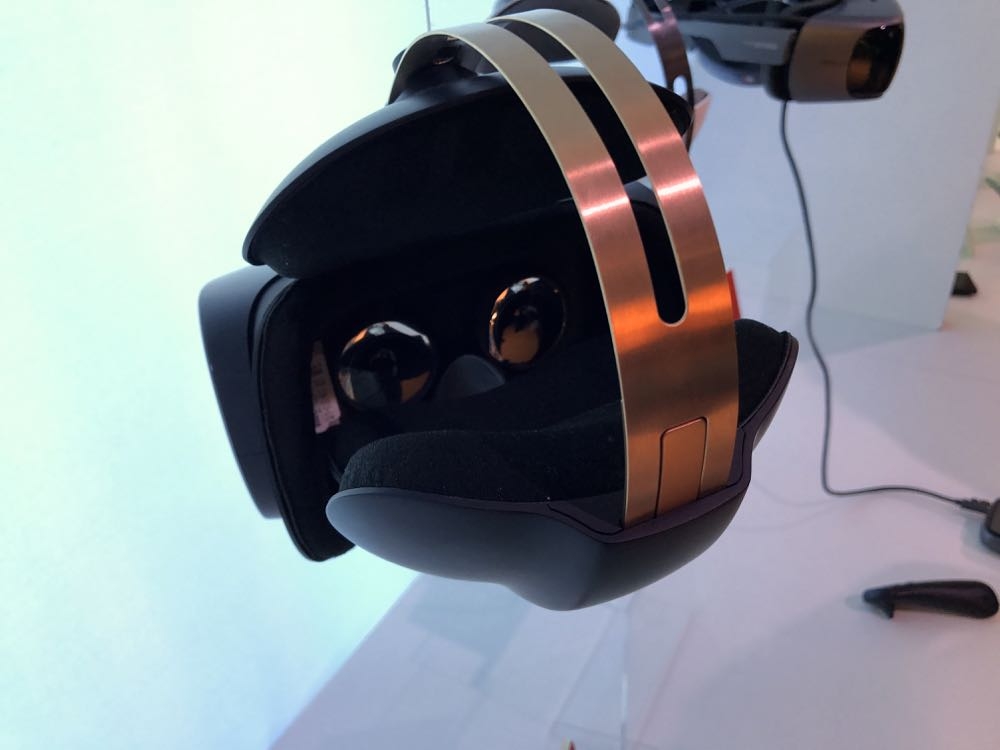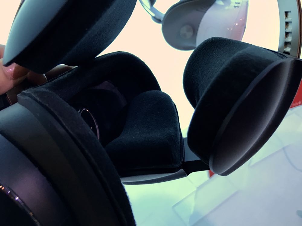 現場看到的這款頭戴式裝置使用的方式有別於一般直接套進去,採用的從頭頂上橫至腦後方,並且下巴還有貼心的設計了柔軟保護墊的一體成型設計。