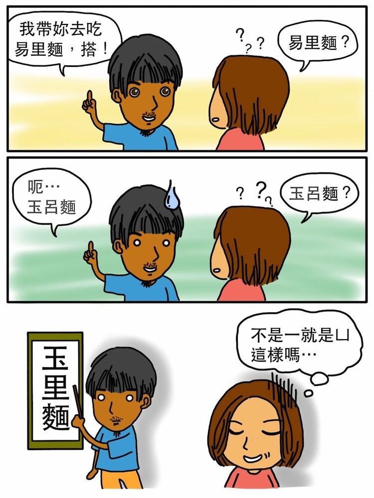 阿米斯媳婦 2017/03/15瀏覽: views 洛洛有他自己獨特的國語發音方式,跟台灣很多其他語系一樣(台語啦,客家語啦),要讀國語時也都有屬於他們獨樹一格的發音方式,剛開始交往時還不太習慣,常常都無法理解他要講什麼 **第一個洛洛對話框的「搭!」是阿美族語(ta)走了!的意思 像這樣ㄧ跟ㄩ的混淆,有時候我都得趕緊補上翻譯才能避免紛爭 XD 到現在相處久了,大概都知道聽這個詞要表達的是什麼意思,不過遇上一些生活少講的詞彙,還是一樣會變成雞同鴨講的局面地~ 很多趣事在『阿米斯媳婦』! Related Items原住民阿米斯媳婦阿美族 好有趣 2017/03/15瀏覽: views 阿米斯媳婦 分享平地人老婆+阿米斯老公的生活趣事,一起感受原民魅力吧! ■聯絡信箱:miahear@gmail.com ■FB粉絲團:https://www.facebook.com/livewithamis Related Items原住民阿米斯媳婦阿美族 next page