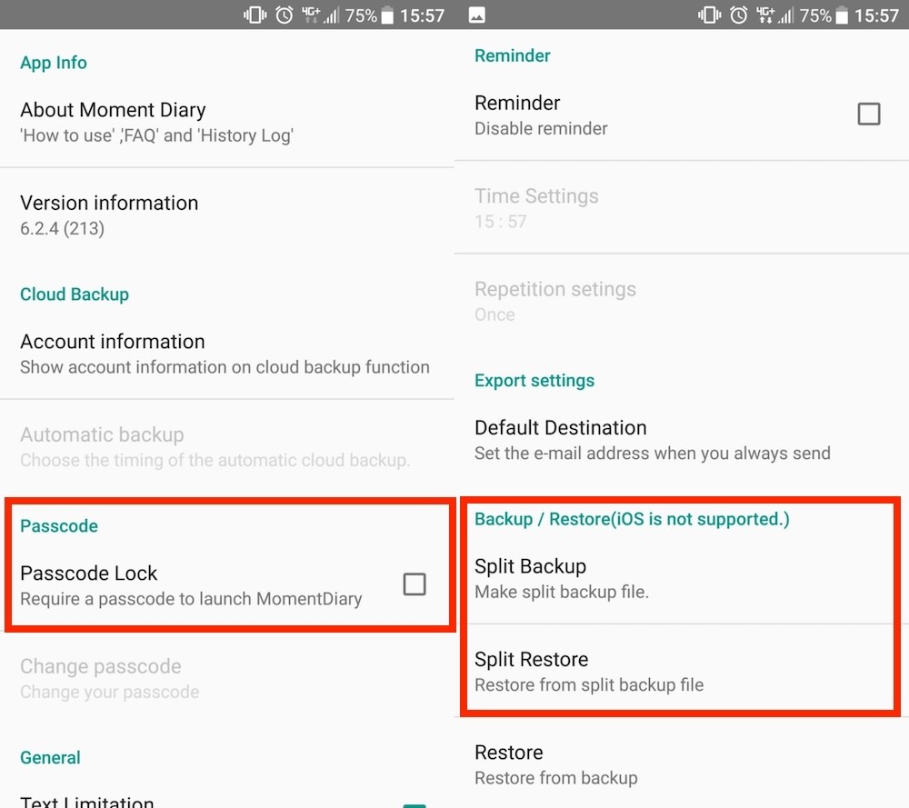 有鑒於許多用戶都會擔心自己的日記被他人偷看,Moment Diary App 內建密碼鎖功能,用戶只要進入設定頁面將「Passcode Lock」勾選起來,接著再設定個人專屬密碼,即可防範有心人偷看自己日記的狀況發生。執得一提的是,在 Android 版本中還多了一項日記備份於 SD 記憶卡的功能,同樣進入設定頁面,接著滑動至頁面最下方,點選「Backup/Restore」中的選項,即可進行日記的備份或還原動作。