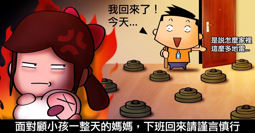 或許上班真的很累,但是我覺得在家面對小孩一整天的媽媽絕對是累上加累,當小孩一亂起來,真的容易讓人體力、情緒、精神都被逼到極限,在這種狀況下看到回到家的老公,以媽媽的角度來看,絕對是趕快給我接手,讓老娘休息;以爸爸的角度來看,就像打籃球快 24 秒進攻違例,要準備拆炸彈了!以前畫過一篇媽媽的地雷,今天來聊一下爸爸下班回家後的生存法則好了,因為老公要面對的是已經崩潰邊緣、易怒、失去理智的老婆,任何話都有可能被誤解,為了保持皇城間的和氣,我們的用字遣詞都要很小心呢!